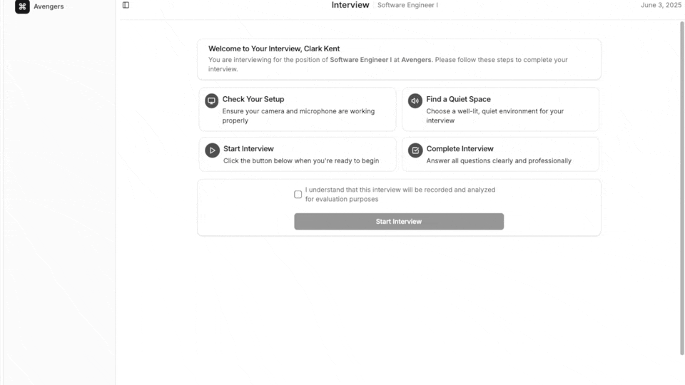 The candidate attends an interview where they answer questions from a pre-defined set of questions from question banks created by the user. These answers are recorded and transcribed. Our AI then analyzes candidate responses based on predefined criteria, assesses technical skills and provides objective scores and insights. A report is generated for the user to view, evaluate and download.